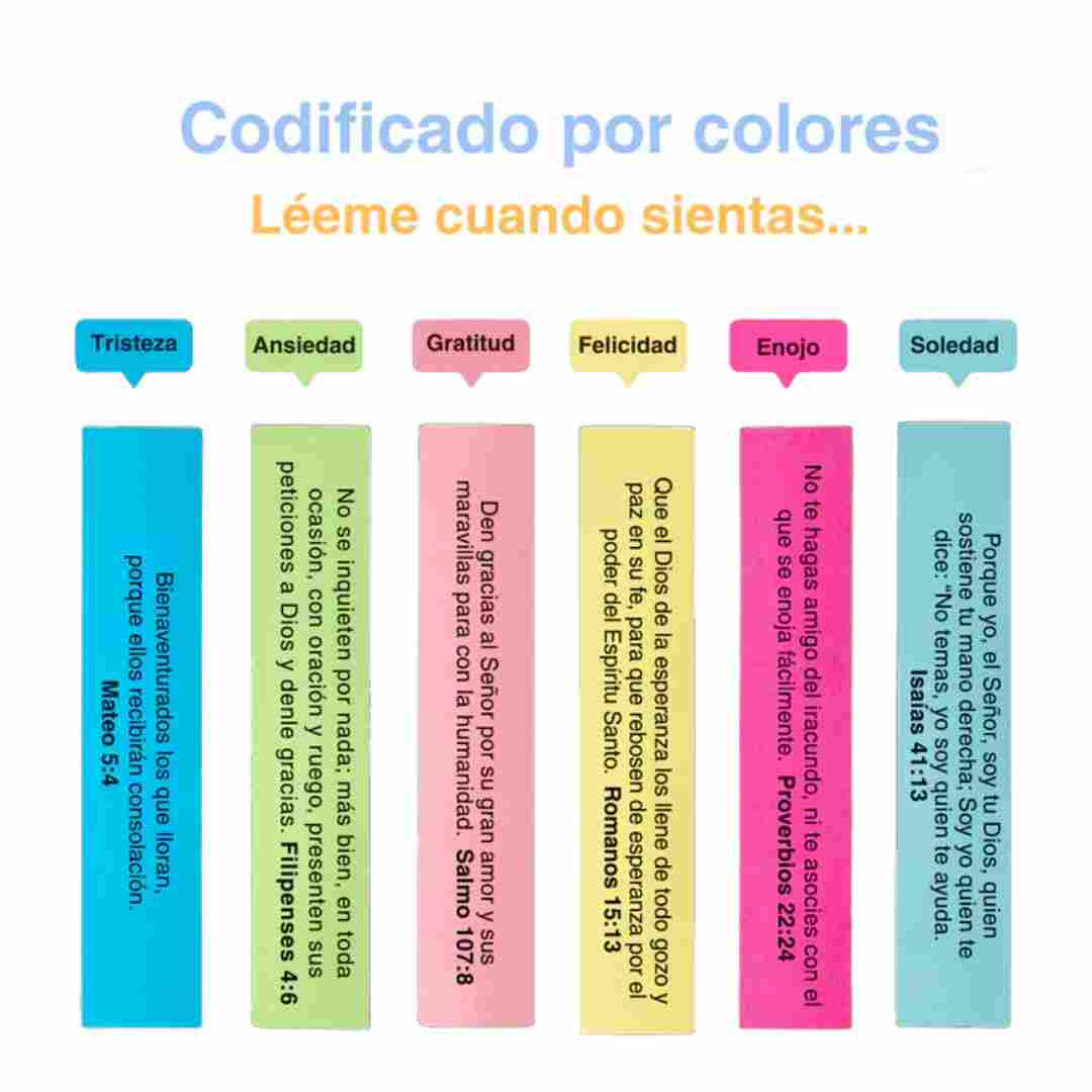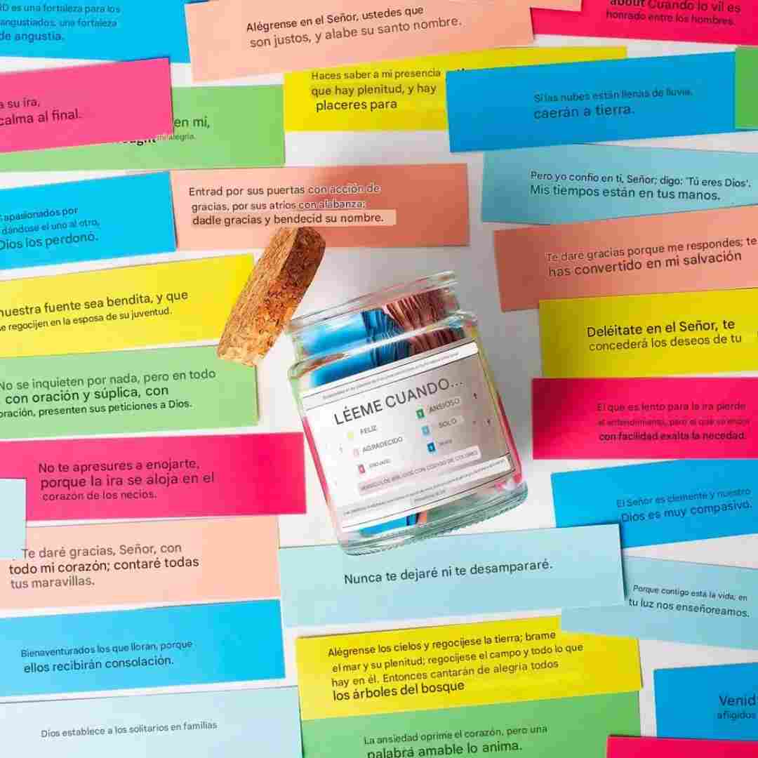 Contiene 100 versículos bíblicos cuidadosamente seleccionados, impresos en pequeños papeles, listos para leer cada día o cuando más los necesites.