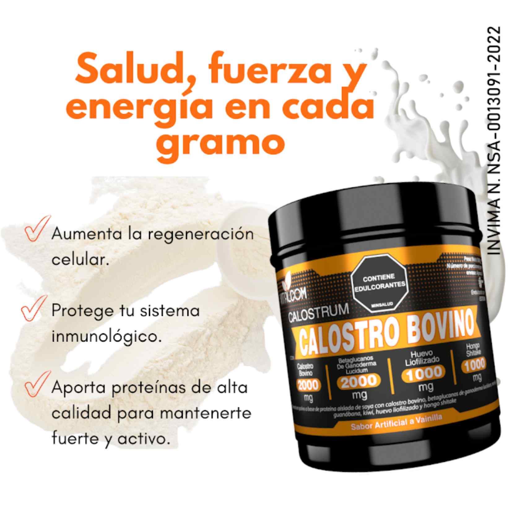 Su fórmula avanzada con 2000 mg de Calostro Bovino, Ganoderma, Moringa, Guanábana, Kiwi y más superalimentos refuerza tus defensas, acelera la recuperación y te da la vitalidad que tu cuerpo necesita.