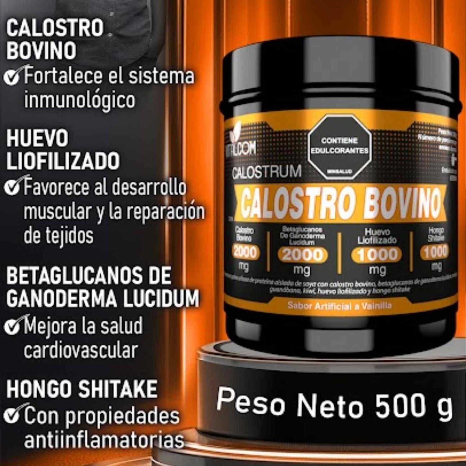 • 🛠️ Fórmula avanzada: 2000 mg de Calostro Bovino, 2000 mg Betaglucanos de Ganoderma, 1000 mg Huevo Liofilizado, 1000 mg Hongo Shiitake, más moringa, guanábana y kiwi.